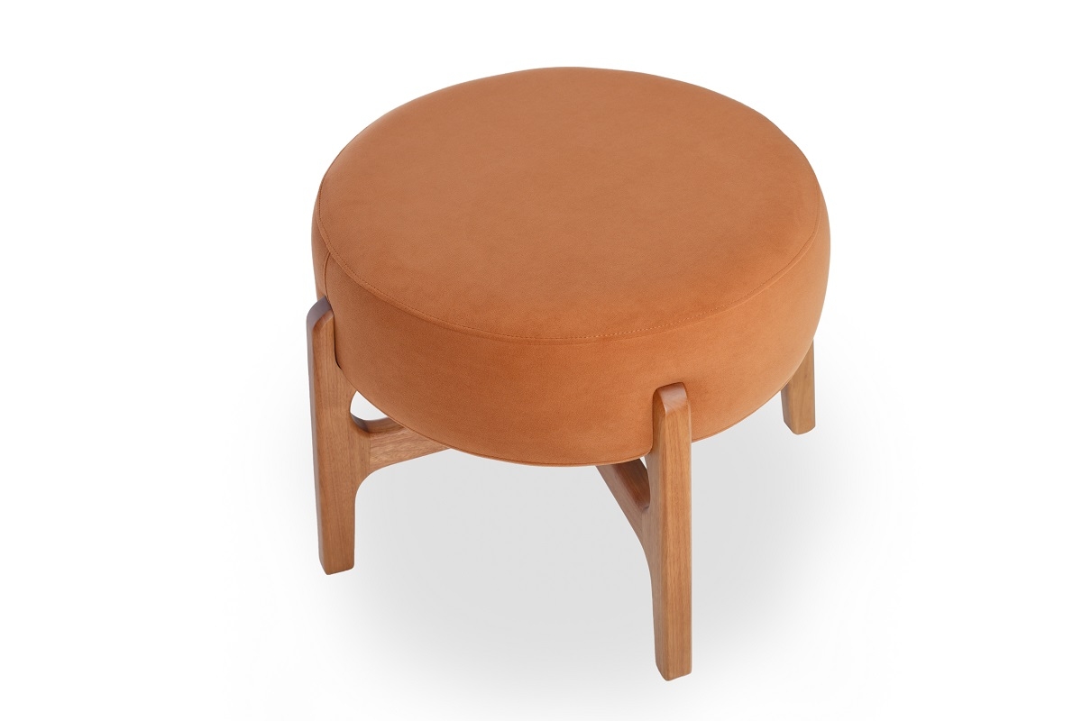 Puff com pés em madeira e assento estofado.